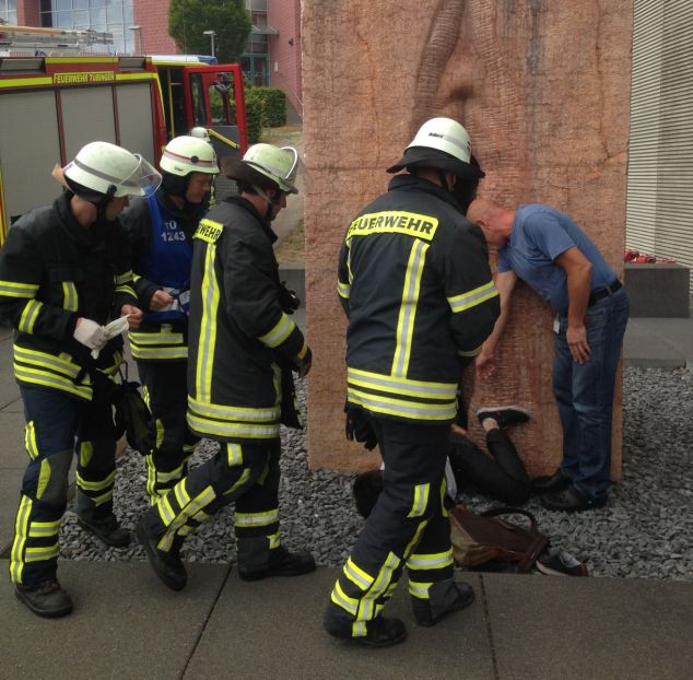 टुइबिन्जेन फायर सर्भिसका एक कर्मचारी मार्कस मोजरका अनुसार शुक्रबार यो घटना भएको हो । फोटो खिच्नका लागि ढुंगाबाट बनेको योनीको मूर्तिमाथि चढ्दै गर्दा चिप्लिएर ती युवा अडि्कएका थिए ।